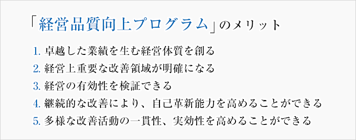 経営品質向上プログラムとは、企業が卓越した業績を生み出せる経営革新を実現する体質を作り上げるための考え方や施策のことです。企業が提供する製品・サービスを含むあらゆる活動においてお客様の満足の向上を目的とし、お客様が求める価値を継続して提供し、市場の競争力を維持しつづけることを目指します。