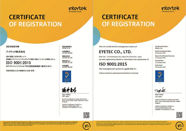 当社では、2000年2月に 福井県内の眼鏡業界としてはじめて ISO 9001 認証取得・2001年1月に 眼鏡業界としてはじめて ISO 14001 認証取得をし、以降も継続的に最新版への更新取得を行っております。